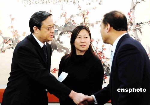 当地时间五月二十日下午,大华府华侨华人及留学生代表来到中国驻美使馆,悼念四川大地震死难同胞并举行向中国地震灾区捐款仪式。大华府华侨华人迄今总共为灾区捐款近三十万美元。图为周文重大使(左)代表灾区接受北京大学校友会代表吕玫(中)、穆毅瑞(右)和其他侨社捐款,并感谢侨胞们一片爱心。