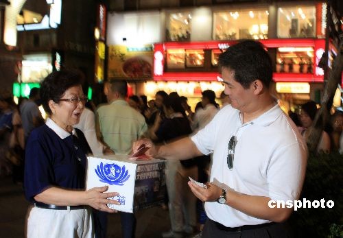 五月二十日晚,一名台湾民众在街头见到为四川赈灾募捐的慈济义工,毫不迟疑掏出一把钞票塞入募捐箱。