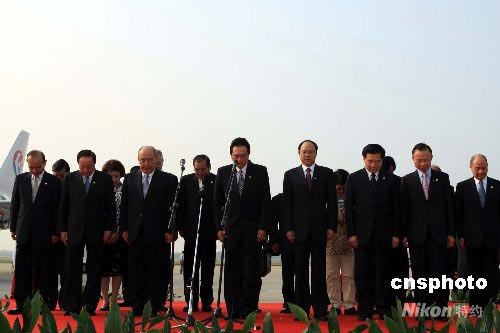 5月26日,中国国民党主席吴伯雄抵达南京,中共中央台湾工作办公室主任陈云林到机场迎接。吴伯雄主席将率中国国民党访问团于26日至31日在南京、北京、上海访问。他将此行定位为“工作会谈”,一方面要为未来马英九就任后的两岸关系开路,一方面也要前往南京中山陵拜祭。图为吴伯雄、陈云林等南京禄口机场默哀悼念四川地震遇难者。中新社发 盛佳鹏 摄