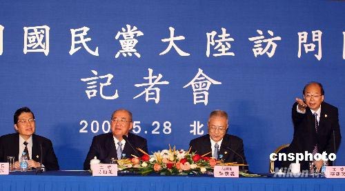5月28日,中国国民党主席吴伯雄一行在北京召开记者会,吴伯雄在记者会上致辞并回答记者的提问。中国国民党秘书长吴敦义、中国国民党文传会主委李建荣、中国国民党副秘书长张荣恭出席记者会。中新社发 盛佳鹏 摄
