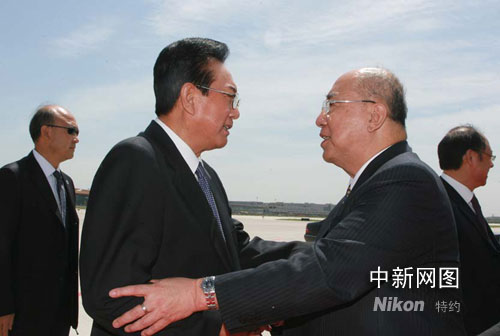 中国国民党主席吴伯雄29日上午乘包机离开北京飞赴上海,中共中央台办主任陈云林送行。摄影 廖文静