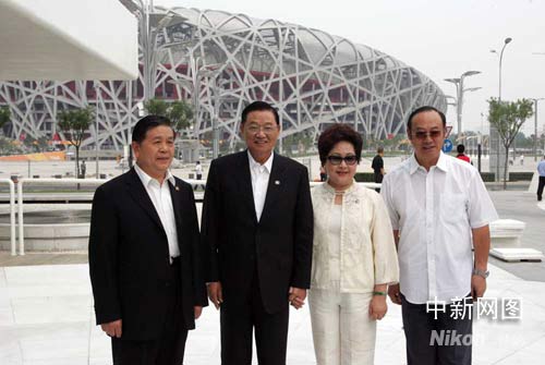 6月12日下午,海峡交流基金会董事长江丙坤参观了北京奥运会场馆,图为江丙坤等人在“鸟巢”前留影。中新社记者 张宇 摄