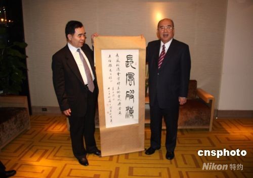 图为柳斌杰向吴伯雄赠送“长风破浪”的书法条幅。