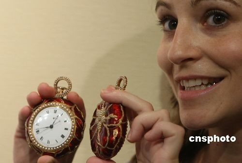 十月二十三日,佳士得在香港举行记者会,展示十二月三日名表拍卖会上的精品。图为模特展示一款由英国皇室赠送给中国乾隆皇帝的石榴形怀表,估价一百二十万至二百万港元。中新社发 武仲林 摄