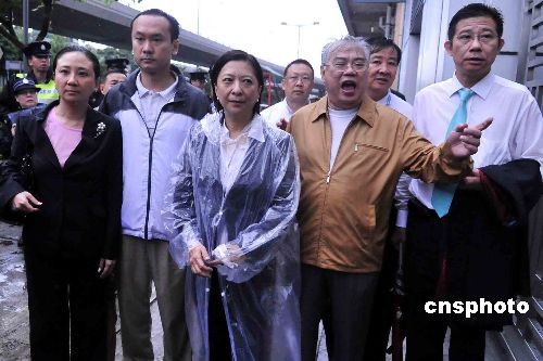 十一月三日,香港民建联副主席蒋丽芸(右三)及立法会议员黄定光(右二),与几十名中小企的代表早上由遮打花园游行至政府总部,他们不满银行缩减信贷额,令营运资金紧绌,难以周转。中新社发 谭达明 摄