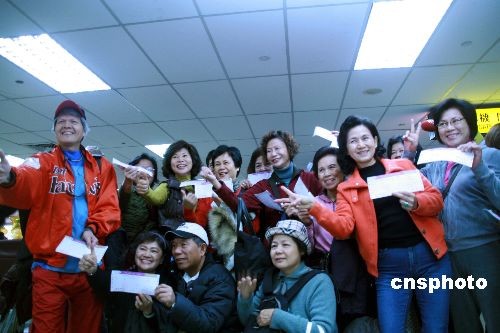 图:台湾至大陆首航平日包机乘客合影留念