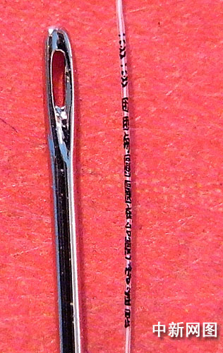 为欢迎大熊猫团团圆圆到台湾定居,台湾著名微雕家陈逢显在一根自己斑白的头发上雕刻了两只大熊猫并在下面写上“团团与圆圆在台湾陈逢显”十一个字。左侧为小缝衣针,右侧为0.5厘米长的白头发。 中新社记者 陈立宇 摄