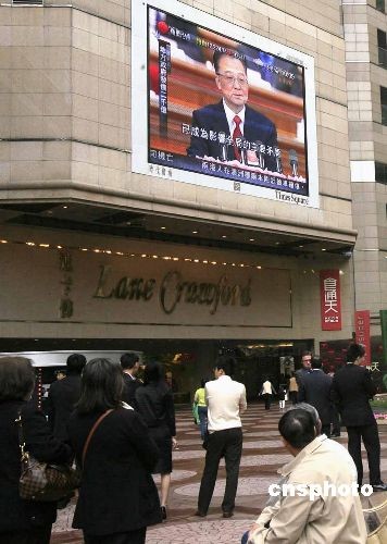 三月五日上午,香港市民在时代广场通过大屏幕收看国务院总理温家宝在十一届全国人大二次会议上作的《政府工作报告》。中新社发 张勤 摄