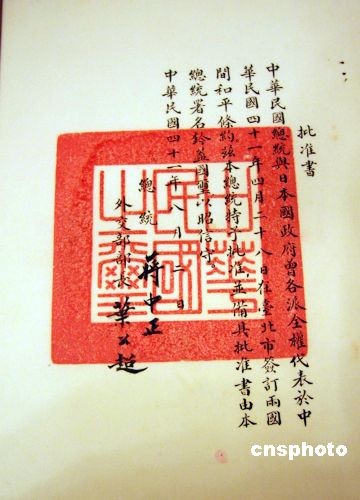 四月二十八日,台湾“国史馆”在台北宾馆举办《百年回眸-台北宾馆的故事》展览,首次展出蒋介石签署的中日和约批准书及相关档案。图为展出的蒋介石签署的中日和约批准书。中新社发 耿军 摄
