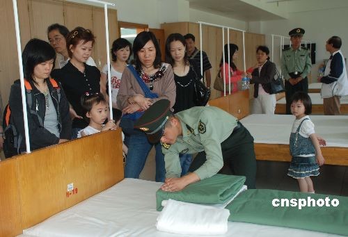中国人民解放军驻澳门部队五月一日第六次向澳门社会开放军营,市民们对战士宿舍里的“豆腐块”被子啧啧称奇。中新社发 毕永光 摄