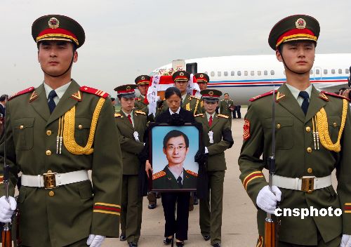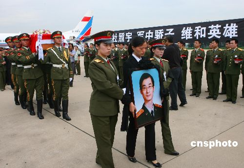 8月2日,接运杜照宇灵柩回国的专机飞抵北京南苑机场,杜照宇的妻子李玲玲手捧杜照宇遗像。北京时间7月26日凌晨,以色列空军袭击了联合国驻黎巴嫩维和部队希亚姆观察哨所,造成包括杜照宇在内的四名联合国军事观察员不幸遇难。中新社发 廖攀 摄