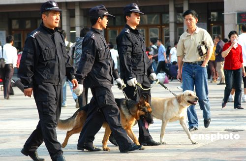 图为北京站巡查的安保人员。“十一”黄金周,北京铁路警方抽调105名精锐警力参加各大车站的黄金周安保,针对节日期间开行的旅游列车和途经京郊旅游车站的列车,警方加派警力、加大巡视密度,确保列车安全。中新社发 田福良 摄