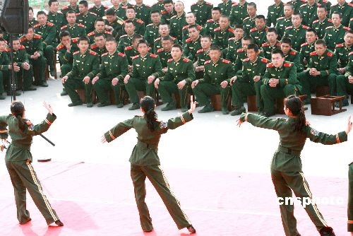 2月22日,武警江苏总队文工团演员为苏州武警官兵表演舞蹈。当日,武警江苏总队政治部文工团组织“慰问抗雪救灾一线官兵及新战友专场文艺巡演”之首场演出活动,在苏州武警支队新兵营训练场热闹开演。中新社发 苏秀 摄