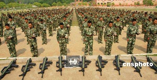 5月19日14时28分,武警驻无锡某部官兵在训练场向汶川大地震遇难同胞默哀3分钟。当天,武警部队全体官兵在各自岗位上以不同方式向地震遇难者致以深切哀悼。据武警指挥中心5月16日统计,在这次四川抗震救灾行动中,武警部队已出动近30000名官兵,共转移、救治群众8.9万余人,搜救、挖掘被压埋群众6270人,目前全军和武警部队捐款已达1.5亿多元。中新社发 李 杰 摄