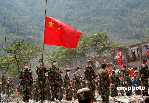 五月十九日下午两点二十八分,在重灾区北川参与救援的武警四川总队内江市支队一百余名官兵举行降半旗仪式,为地震遇难者默哀。中新社发 阳年刚 摄