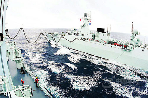 海军首赴亚丁湾、索马里海域护航编队指挥舰“武汉”号、“海口”号导弹驱逐舰与“微山湖”号综合补给舰正在加紧训练,以高标准完成护航任务。图为近日编队进行海上补给演练时的情景。 中国军网发 朱光耀 摄