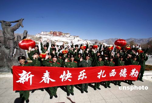 春节临近,1月18日,武警西藏总队拉萨市支队一中队官兵手捧哈达和红灯笼,向全国人民祝贺新春快乐:扎西德勒。中新社发 赵艳志 摄