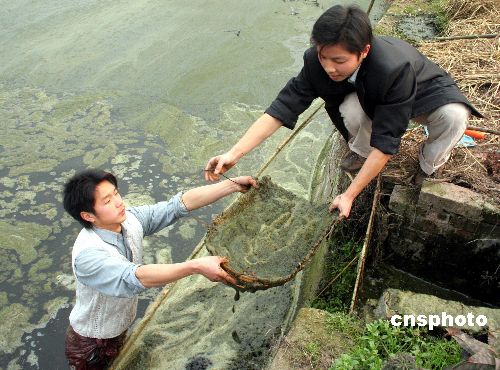 2月15日,西南大学(荣昌校区)动科系04级师范一班学生肖虎和杨伟平,在清理他们所承包的鱼塘水面上的浮萍。来自四川宜宾和巴中农村的肖虎和杨伟平同学,家庭比较贫困。2006年10月他们一起在荣昌县昌元镇海螺村7社承包了一处5亩鱼塘,打算靠养鱼勤工俭学。放寒假后,他们决定今年春节不回家,抓紧春节期间鱼俏好销时机,赚取新学期的学费。中新社发 朱芸锋 摄