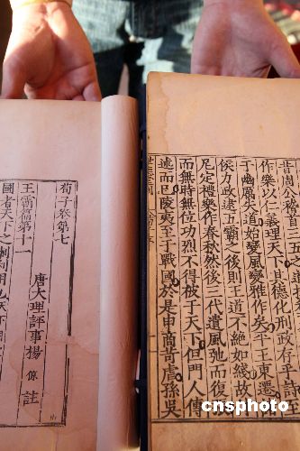 北京地坛秋季书市十一月上旬正在火爆进行中,今年亮点之一的旧书淘宝一条街,成为许多酷爱古旧图书的“书虫”光顾最多的去处。图为价值十余万的明嘉靖世德堂刻印——《荀子二十卷》亮相北京秋季书市。中新社发 任海霞 摄