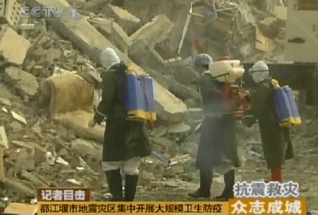 地震救援实施的同时,都江堰市地震灾区展开大规模卫生防疫。(电视截图)