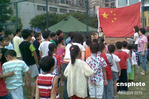 5月19日上午,在成都市青羊区体育中心安置点设置的“青羊区抗震救灾爱心家园学校”开学。该校目前分小学、初中、高中三个班,共有80多名学生。图为开学时举行的升国旗仪式。中新社发 魏姝 摄