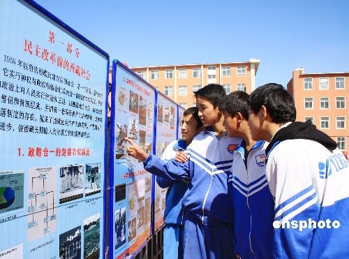 3月27日,辽宁省辽阳市第一中学西藏班学生在观看《西藏今昔》图片展。近日辽阳市第一中学开展了纪念百万农奴解放50周年专题教育活动,教育学生们牢记历史,珍惜今天的幸福生活。中新社发 曹精义 摄