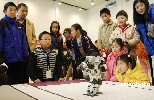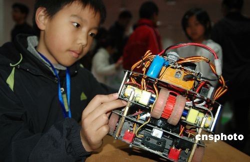2009年3月29日,2009年“VEX”杯苏州市青少年机器人比赛在苏州善耕实验小学开幕,来自苏州敬文实验小学及其周边县市的77所中小学校的467位选手参赛,参赛者分别进行了机器人“踢足球”、“灭火”和“基本技能”等八个项目的角逐,场面十分热闹。中新社发 苏民 摄