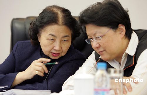 出席十届全国人大五次会议的梁爱诗(左)、范徐丽泰等香港代表,三月九日在驻地北京饭店参加分组会,审议物权法草案与企业所得税法草案。中新社发 毛建军 摄