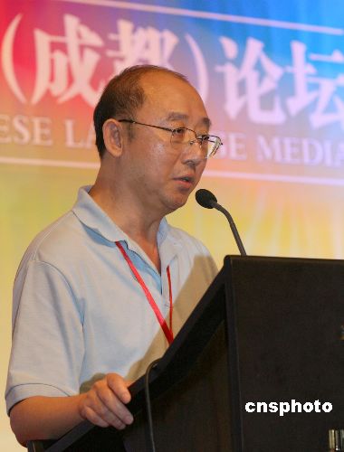 9月3日,正在四川成都举办的第四届世界华文传媒论坛进行大会发言,图为澳门《澳门日报》总编辑陆波做题为《“一国两制”下的传媒定位》的发言。中新社发 张勤 摄