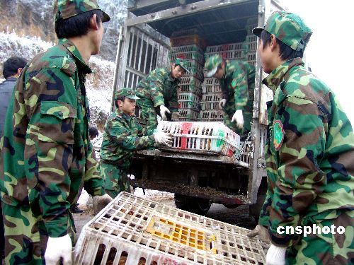 半个多月的凝冻天气,使贵州清镇麦格乡小谷陇村村万余只成熟肉鸡难以运出。1月31日,该市人民武装部的应急民兵紧急出动,帮助村民及时将肉鸡运往收购地点。中新社发 申时进 摄