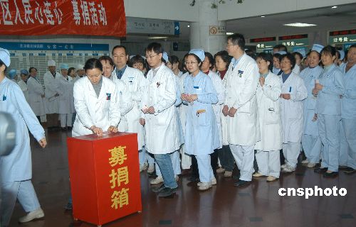 二月五日,北京世纪坛医院职工排队为受灾的南方省、市卫生厅、局捐款。北京卫生局四日向全市卫生系统发出紧急通知,号召广大医务人员向冰雪灾区紧急捐款。据不完全统计,截止五日,已累计捐款四百一十八万八千元人民币。这是北京卫生系统近年来在捐款活动中,时间最短、数量最多的一次。中新社发 曾利明 摄