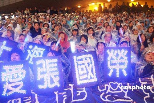 三月三十一日,香港文化中心举行Live Moments·张国荣拉阔时光露天播放会,纪念张国荣逝世五周年。图为观众在雨中观看影片。中新社发 武仲林 摄