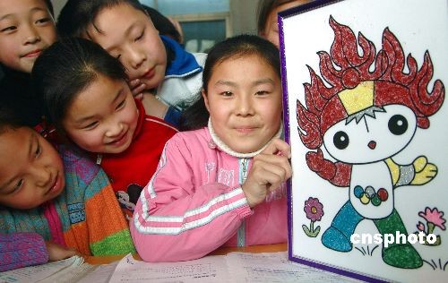 4月9日,几名留守儿童在用七彩画笔绘“奥运福娃”图案。当日,河南社旗县第一小学举办“迎奥运、绘福娃”喜迎北京奥运会倒计时100天活动,30多名留守儿童用手中画笔表达对“北京奥运会”的美好祝愿。作者: 宋同杰