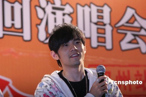 2008年4月10日,周杰伦2008世界巡回演唱会媒体见面会在郑州举行,周杰伦亮相郑州并与广大歌迷见面。中新社发 陈代述 摄