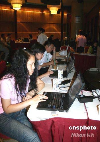四月十一日,海南博鳌。参加博鳌亚洲论坛年会采访的女记者,开始在新闻中心忙碌起来。中新社发 关向东 摄