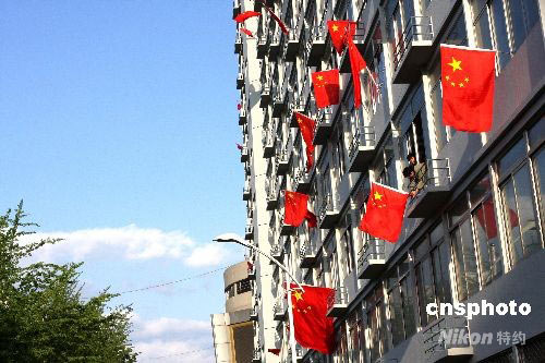 北京理工大学学生宿舍自发挂国旗,理性表达爱国热情。中新社发 郑雄增 摄