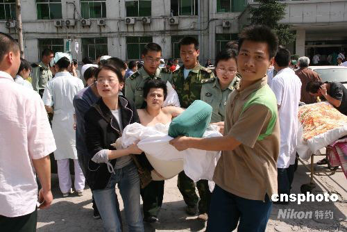 5月12日14点30左右,四川汶川发生7.8级地震,西安有震感,解放军451医院医护人员紧急转移伤病员,并迅速作出反应,搭设帐篷安置伤病员。中新社发 尤中原 摄