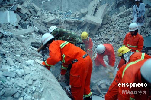 十二日下午两点三十分左右,受四川汶川地震波及,重庆市梁平县文化镇一小学教学楼发生垮塌,目前已造成五名学生死亡,三十六人受伤。图为消防队员正在对被掩埋学生进行搜救。 中新社发 郭晋嘉 摄