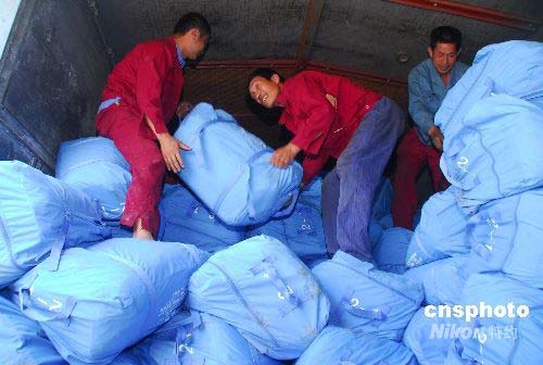 2008年5月13日,在合肥铁路货运站,国家救灾办从安徽省救灾物资储备库调运的1.5万顶帐篷正在紧急装运。当日上午10点首趟由18节车厢组成满载救灾帐篷的“抢87575”专列已经从合肥开出,驶往目的地成都东站。预计当日下午13时30分还将开出另外一趟救援物资专列援助受灾地区人民群众。中新社发 从启 摄