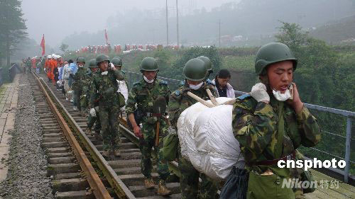 5月15日,河南消防抢险救援突击队步行进入四川省什邡市红白镇营救受困群众。中新社发 张晓理 摄