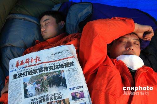 组图:消防搜救队趁搜救间隙休息(5)