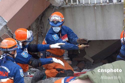 5月18日,日本国际救援队一行二十余人到达中国四川北川地震现场——北川中学,利用国际先进的探测仪器与中国两支救援队分别挖掘废墟,救援受难学生。经过共同探测,在沉入地下的楼层内发现有三个生物体存在,但挖掘极为危险和困难,生者生命渺茫。图为日本小队在工作中。中新社发 邹宪 摄