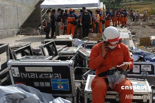 5月18日,日本国际救援队一行二十余人到达中国四川北川地震现场——北川中学,利用国际先进的探测仪器与中国两支救援队分别挖掘废墟,救援受难学生。经过共同探测,在沉入地下的楼层内发现有三个生物体存在,但挖掘极为危险和困难,生者生命渺茫。图为日本救援队成员在休息时依然思考救援问题。中新社发 邹宪 摄