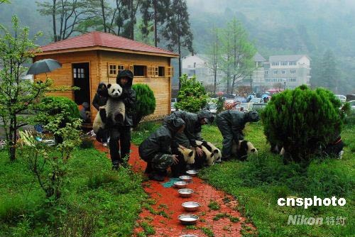 四川发生大地震后,卧龙保护区管理局的职工于第一时间将大熊猫转移到安全地带。在此次地震中,卧龙保护区管理局的房舍严重受损,其中32套大熊猫圈舍中有14套全部损毁,其余严重受损。据悉,工作人员目前正在寻找二到三只下落不明的大熊猫,其余所有熊猫被集中饲养在简单修复的圈舍中,但圈舍比较拥挤。国家林业局和四川省林业厅已紧急调拨熊猫食品、药品,以及保护区内职工急需的帐篷等救援物资,现已绕道送至卧龙自然保护区。中新社发 卧龙 摄