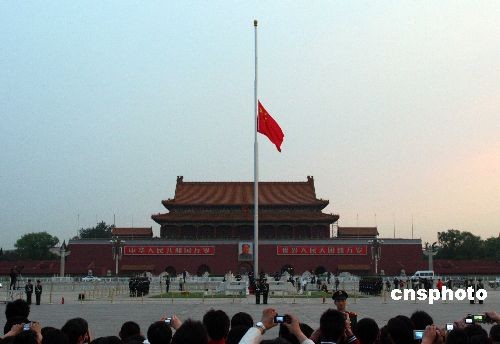 5月19日清晨,北京天安门广场下半旗,哀悼5·12汶川大地震中遇难同胞。中国国务院作出决定,5月19日至21日为全国哀悼日。在此期间,全国和各驻外机构下半旗志哀,停止公共娱乐活动,中国外交部和中国驻外使领馆设立吊唁簿。5月19日14时28分起,全国人民默哀3分钟,届时汽车、火车、舰船鸣笛,防空警报鸣响。 中新社发 富田 摄