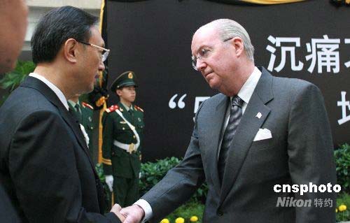 美国驻华大使雷德(右)前往吊唁时,与中国外交部部长杨洁篪握手,表示美方将增加对华救灾援助。中新社发 廖文静 摄
