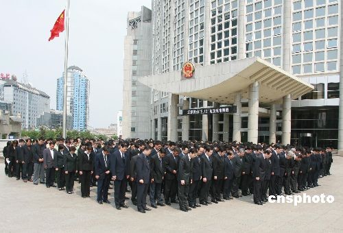 5月19日,中国外交部全体人员在外交部主楼外举行庄重的默哀活动,表达对四川汶川大地震罹难同胞的深切哀悼。中新社发 廖文静 摄