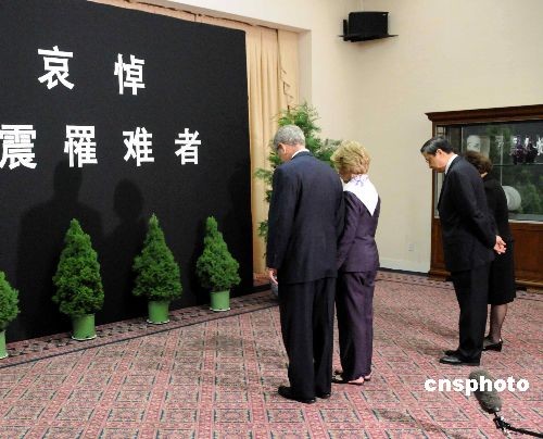 图为布什夫妇在周文重大使夫妇陪同下在中国大使馆向地震遇难者默哀。中新社发 邱江波 摄