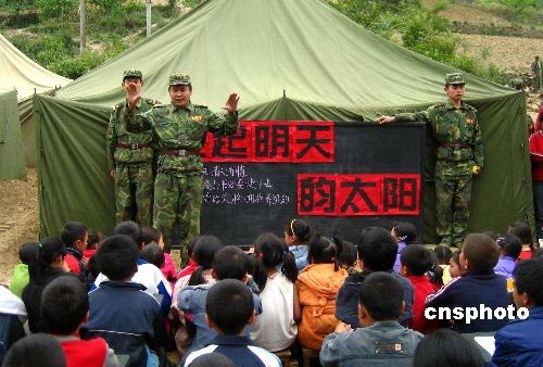 5月20日,四川省平武县南坝镇垭头坪村,解放军某装甲师炮兵团在这里建立的“托起明天的太阳”灾区战地小学正式开课。中新社发 汪景磊 摄