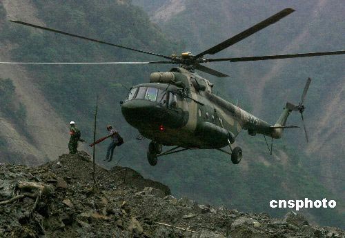 五月二十日上午十时,成都军区陆航团姜广伟王牌直升机组成功强降北川重灾区“定时炸弹”--堰塞湖无名塌方小土堆上,水利地质技术人员紧急跳下飞机,投入实地监测水位。 中新社发 贾国荣 摄